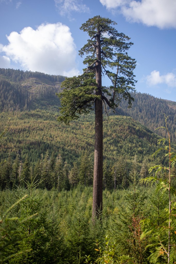 The San Juan Spruce is named for the San Juan Valley in which it grows, one of the largest and flattest on Vancouver Island with ideal conditions for gigantism among its tree, but you wouldn’t know to see it. Making a wrong turn on my way to other titans, I ended up on a ridge overlooking the valley, and for all my staring, I couldn’t find a square inch not covered in cut blocks. They exist, certainly, but they are scraps so small no casual visitor could hope to find them. A hundred years ago, this valley might have supported the largest big-treed forests on Vancouver Island. Now there’s just an old man, trying to remember his strength.